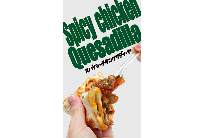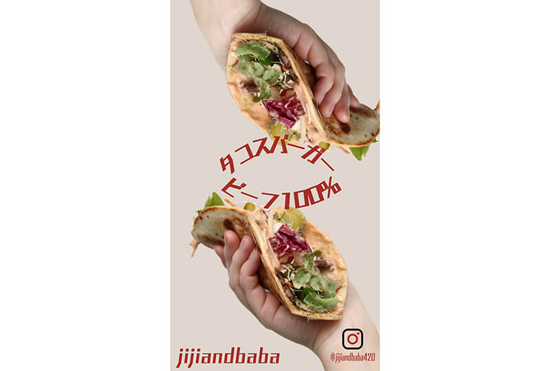 『タコスバーガー』beef100%パティにスパイス、自家製ソースを使用し、スマッシュに焼きあげフラワートルティーヤでシャキシャキ野菜と包んでおります。